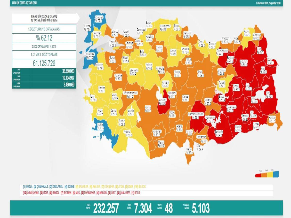 Birinci doz Türkiye ortalaması yüzde 62.12, ikinci doz ortalaması yüzde 30.78, birinci, ikinci ve üçüncü doz toplamı ise 61 milyon 125 bin 726 oldu.