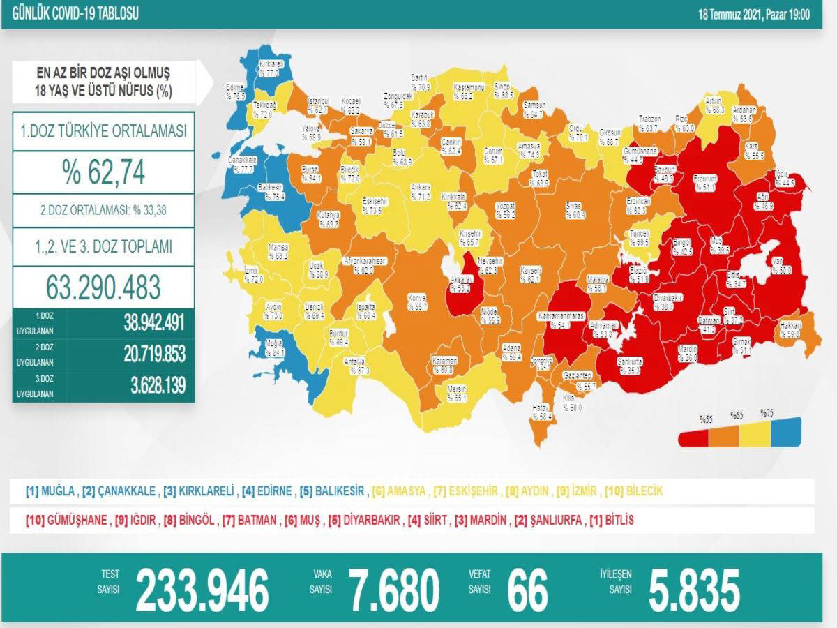 Türkiye'de son 24 saatte, 7 bin 680 yeni vaka tespit edilirken 66 kişi hayatını kaybetti. Öte yandan 5 bin 835 kişi de sağlığına kavuştu.