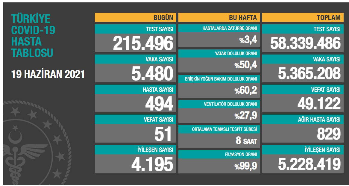 Türkiye'nin 19 Haziran 2021 güncel koronavirüs tablosu şöyle: