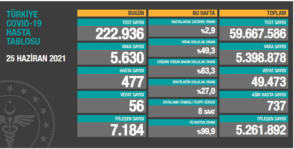 Türkiye'nin 25 Haziran 2021 güncel koronavirüs tablosu şöyle: