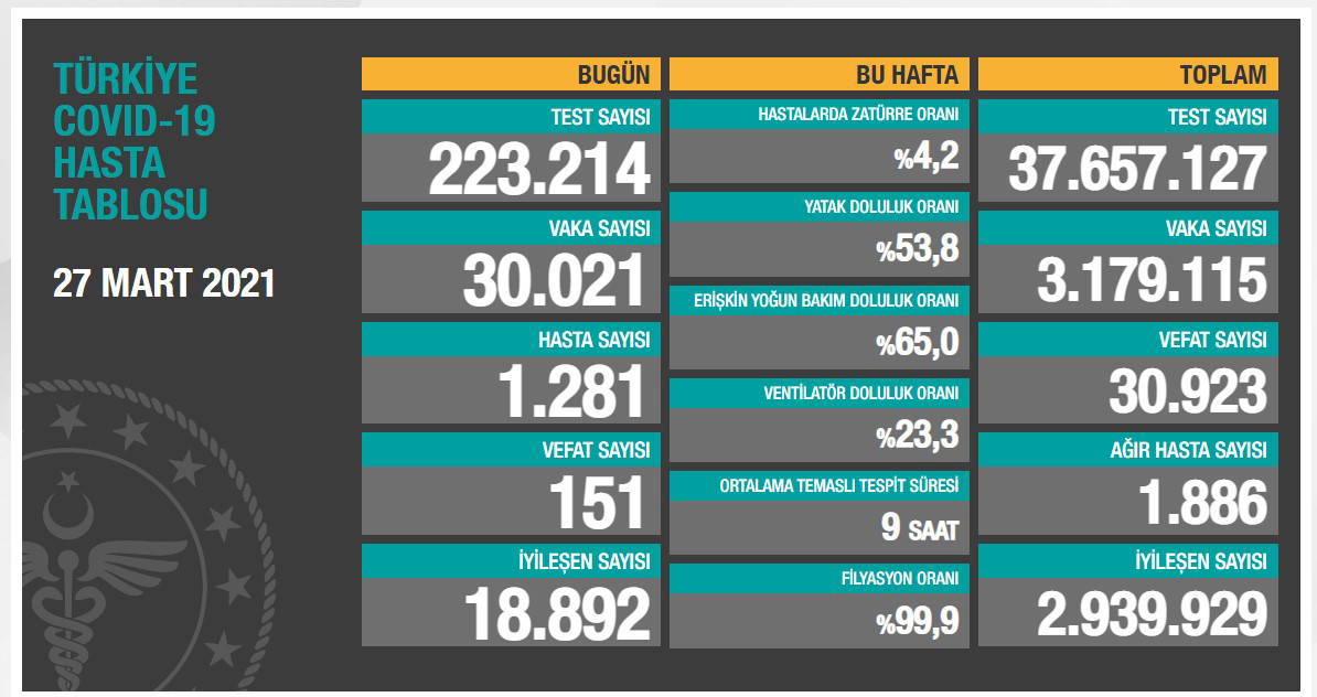 Bugünkü verilerle toplam test sayısı 37 milyon 657 bin 127, toplam vaka sayısı 3 milyon 179 bin 115, toplam vefat sayısı 30 bin 923, toplam ağır hasta sayısı1886, toplam iyileşen sayısı ise 2 milyon 939 bin 929 oldu.