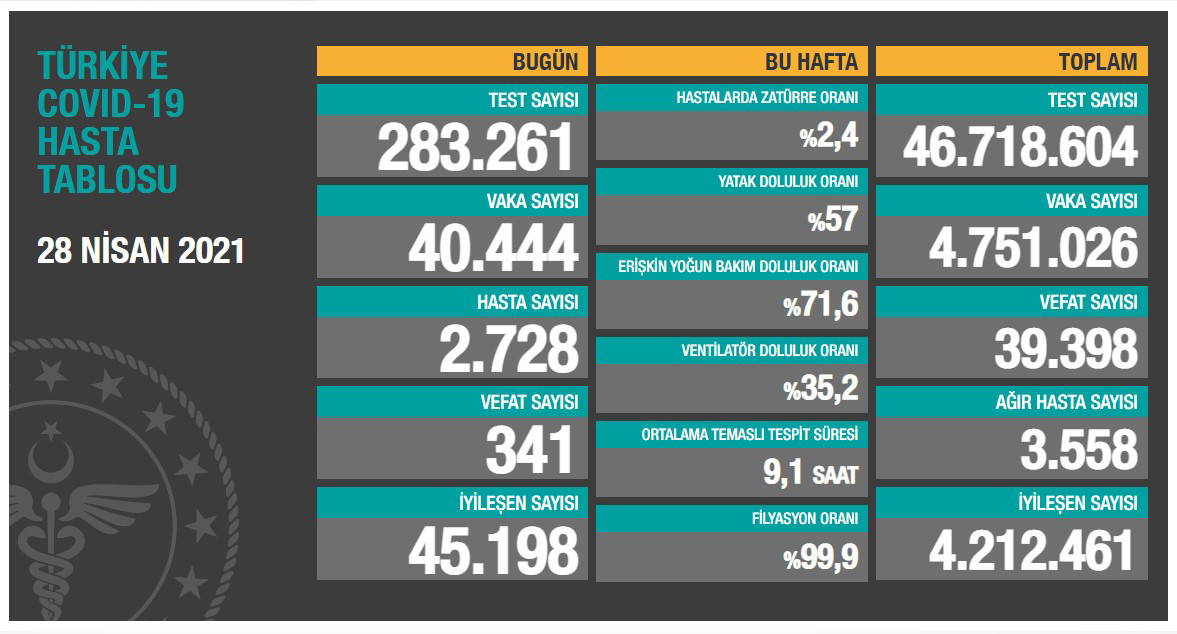 Türkiye'nin 28 Nisan 2021 güncel koronavirüs tablosu şöyle: