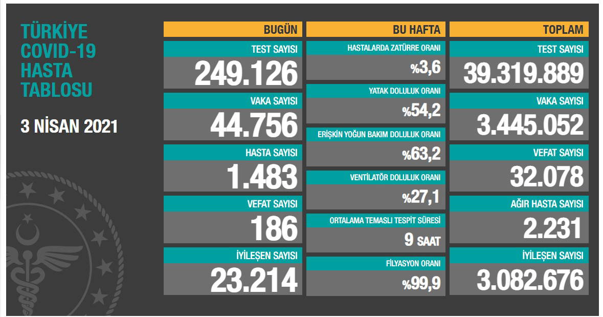 Sağlık Bakanlığı'nın 3 Nisan gününe ilişkin paylaştığı koronavirüs verilerine göre; son 24 saat içerisinde yapılan 249 bin 126 yeni testten 44 bin 756'sı pozitif çıktı. Hasta sayısı 1483, iyileşen sayısı 23 bin 214 olarak açıklandı. Virüs nedeniyle 186 kişi daha yaşamını yitirirken toplam can kaybı 32 bin 78'e yükseldi.