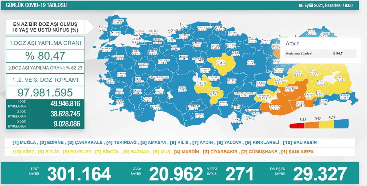 Türkiye'nin 6 Eylül 2021 güncel koronavirüs tablosu şöyle:
