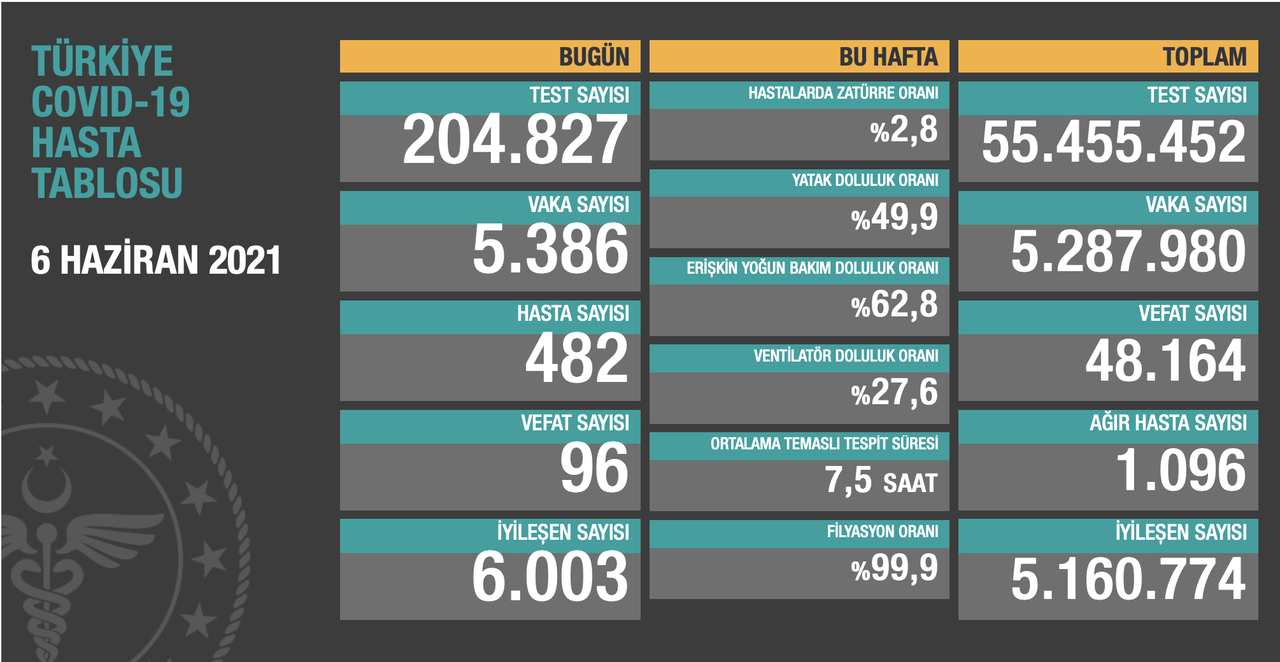 Türkiye'nin 6 Haziran 2021 güncel koronavirüs tablosu şöyle: