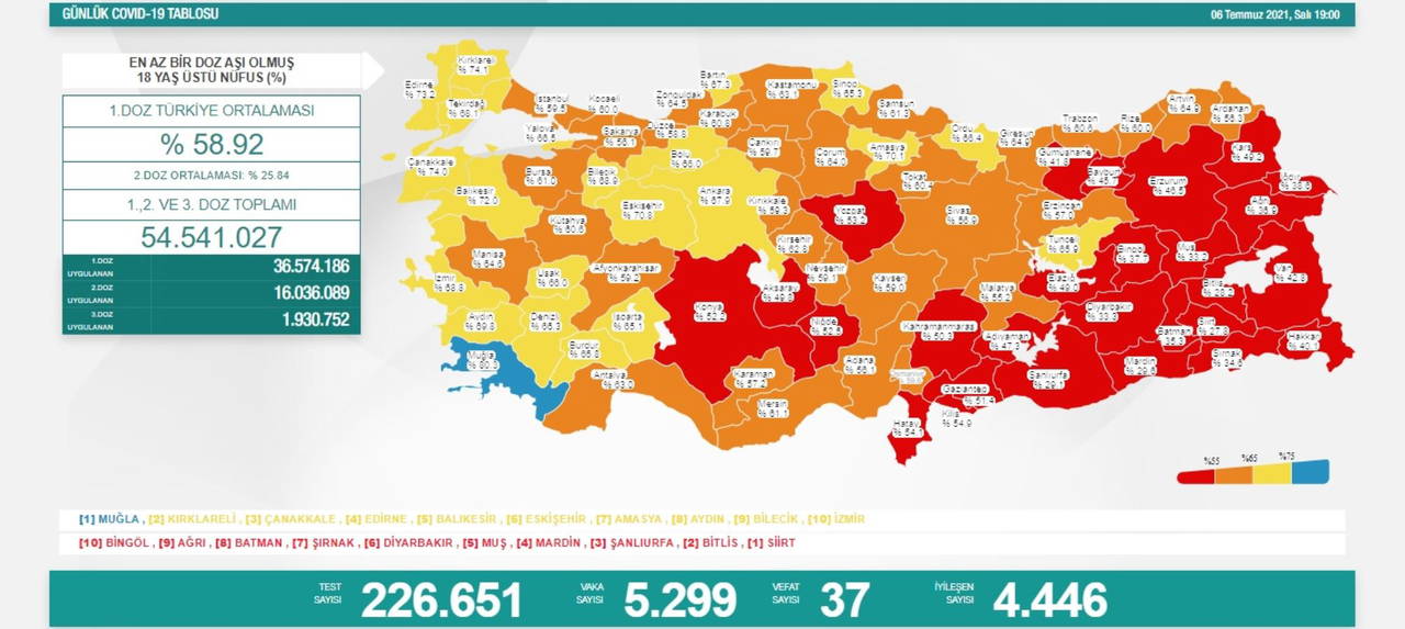 En az bir doz aşı uygulananların oranının en yüksek olduğu 10 il, sırasıyla Muğla, Kırklareli, Çanakkale, Edirne, Balıkesir, Eskişehir, Amasya, Aydın, Bilecik ve İzmir oldu.