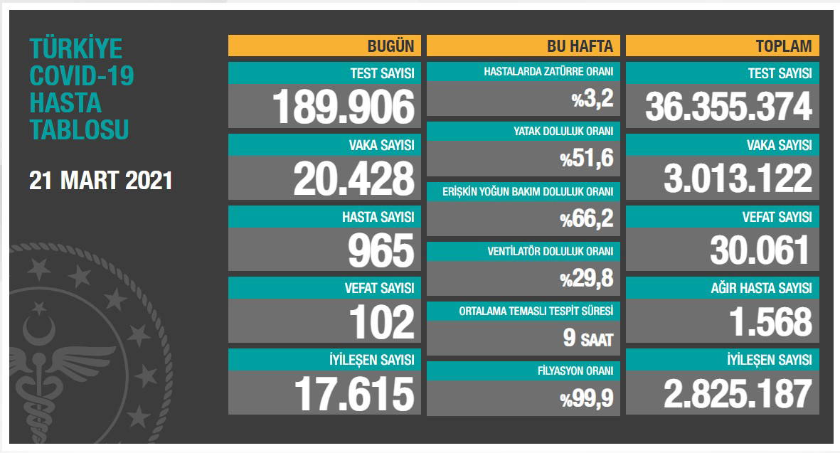 Türkiye'nin 21 Mart 2021 güncel koronavirüs tablosu şöyle: