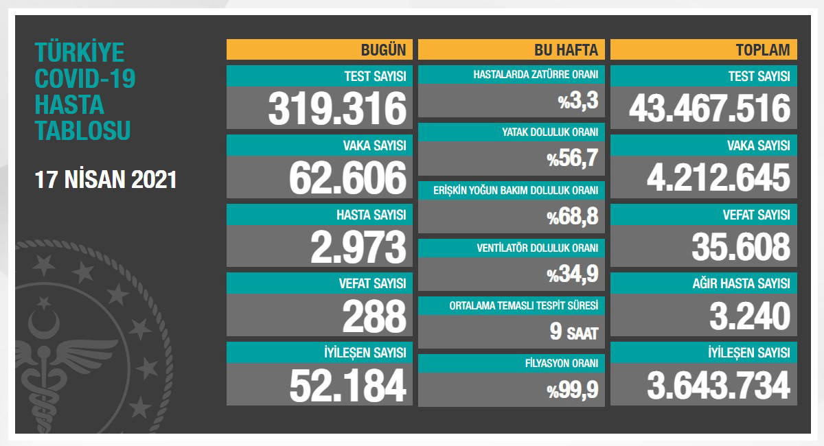Sağlık Bakanlığı'nın 17 Nisan gününe ilişkin paylaştığı koronavirüs verilerine göre; son 24 saat içerisinde yapılan 319 bin 316 yeni testten 62 bin 606'sı pozitif çıktı. Hasta sayısı 2 bin 973, iyileşen sayısı 52 bin 184 olarak açıklandı. Virüs nedeniyle 288 kişi daha yaşamını yitirirken toplam can kaybı 35 bin 608'e yükseldi.