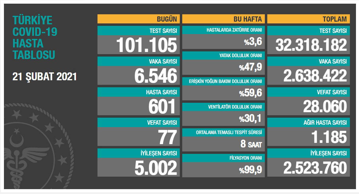 Türkiye'nin 21 Şubat 2021 güncel koronavirüs tablosu şöyle: