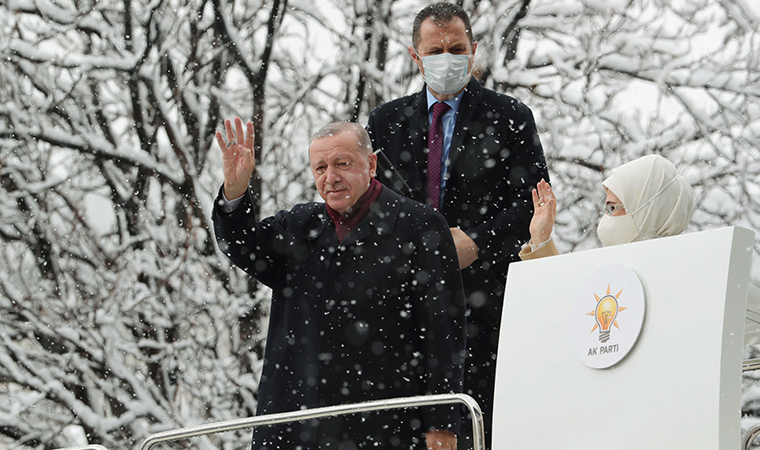 Türkiye'nin dört bir yanından Ankara'ya getirilen partililer, Erdoğan'ın konuşması için salon önünde toplandı. Sosyal mesafenin hiçe sayıldığı anlarda, partililere seslenen Erdoğan, "Kar yağışının tüm mikropları yok ettiği bir gündeki buluşmada sizleri selamlıyorum" ifadelerini kullandı.