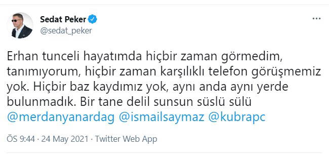 Soylu'nun bu açıklamalarına sosyal medya hesabından yanıt veren Peker, ''Erhan tunceli hayatımda hiçbir zaman görmedim, tanımıyorum, hiçbir zaman karşılıklı telefon görüşmemiz yok. Hiçbir baz kaydımız yok, aynı anda aynı yerde bulunmadık. Bir tane delil sunsun süslü sülü'' ifadelerini kullandı.