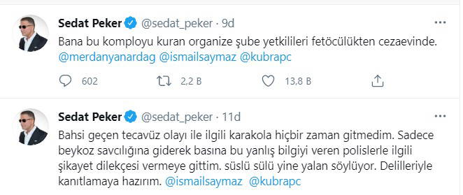 Soylu'nun, ''Bu kadar cürümün işinde olan bir kişi tecavüz etmiş bir kıza. Karakola gidiyorlar ve olay kapanıyor. Burada zanlı Peker, belgesi var'' iddiasına yanıt veren Peker, ''Bahsi geçen tecavüz olayı ile ilgili karakola hiçbir zaman gitmedim. Sadece beykoz savcılığına giderek basına bu yanlış bilgiyi veren polislerle ilgili şikayet dilekçesi vermeye gittim. süslü sülü yine yalan söylüyor. Delilleriyle kanıtlamaya hazırım. Bana bu komployu kuran organize şube yetkilileri fetöcülükten cezaevinde'' dedi.