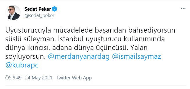 ''Terör örgütleriyle diğer organize suç çeteleriyle nasıl mücadele ettiğimizi biliyoruz. Bazen en büyük uyuşturucu kaçakçılığını onlar vasıtasıyla öğreniyoruz. Baktım ki, bir eleman bir spikerlik yapıyor. Bir sözcülük ortaya koyuyor. İddiaları ve iftiraları tamamen boş olsa da devlete laf ediyor, Türkiye'ye güya kendi adına vesayet ortaya koymaya çalışıyor güya, tırnak içinde. Ve herkese ipiniz elimde diyor ve Türkiye'de bir sessizlik hakim. Neticede terörle mücadele etmişiz, Türkiye'de suç çeteleriyle mücadele etmişiz darbe vurmuşuz. Uyuşturucu ile mücadele ediyoruz, etmişiz'' diyen Soylu'ya yanıt veren Peker, ''Uyuşturucuyla mücadelede başarıdan bahsediyorsun süslü süleyman. İstanbul uyuşturucu kullanımında dünya ikincisi, adana dünya üçüncüsü. Yalan söylüyorsun'' ifadelerini kullandı.