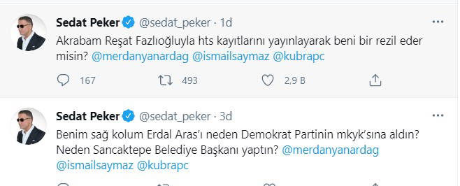 Soylu'ya soru yönelten Peker, ''Benim sağ kolum Erdal Aras’ı neden Demokrat Partinin mkyk’sına aldın? Neden Sancaktepe Belediye Başkanı yaptın? Akrabam Reşat Fazlıoğluyla hts kayıtlarını yayınlayarak beni bir rezil eder misin?'' diye sordu.