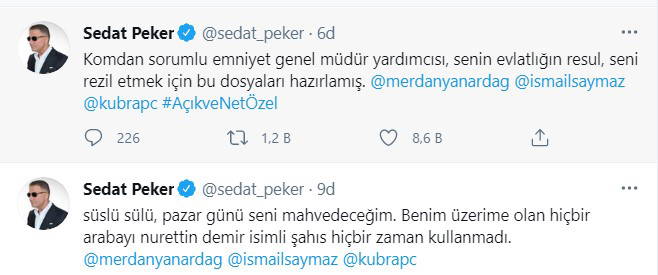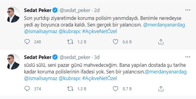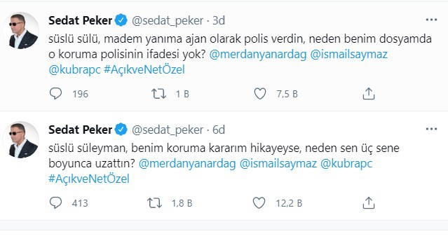 Soylu'nun, ''Sedat Peker'in korumaya mı ihtiyacı var? Ben akademisyenleri kan banyosunda yıkayacağım. AK Parti'nin lehine midir aleyhine midir? Rize'deki toplantısına suç duyurusunda bulunulmuş. Peki koruma nasıl verildi? 2015'te sanal bir tehditle DHKP-C'nin bu kişiyi tehdit ettiği ortaya çıkar. Derler ki şu şu sebeplerden dolayı tehdit var, bu sebeple koruma vereceğiz. Sonra bu kişi (Nurettin Demir - Eski Kadıköy Emniyet Müdürü) FETÖ'den cezaevinde. Sedat Peker'in jipini kullanırdı'' ifadelerine yanıt veren Peker, ''Süslü Sülü, pazar günü seni mahvedeceğim. Benim üzerime olan hiçbir arabayı Nurettin Demir isimli şahıs hiçbir zaman kullanmadı. Komdan sorumlu Emniyet Genel Müdür Yardımcısı, senin evlatlığın resul, seni rezil etmek için bu dosyaları hazırlamış. Süslü Süleyman, benim koruma kararım hikayeyse, neden sen üç sene boyunca uzattın? Süslü sülü, seni pazar günü mahvedeceğim. Bana yapılan dosyada şu tarihe kadar koruma polislerinin ifadesi yok. Sen bir yalancısın'' dedi.