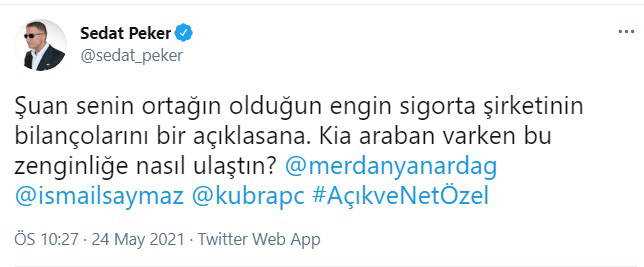 Peker, ''Şuan senin ortağın olduğun engin sigorta şirketinin bilançolarını bir açıklasana. Kia araban varken bu zenginliğe nasıl ulaştın'' dedi.