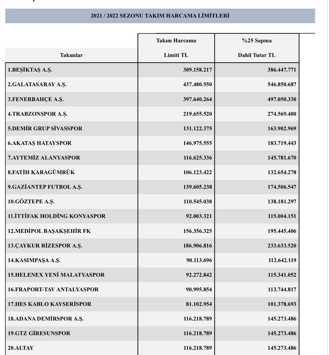 TFF, Süper Lig'de 2021-22 sezonunun harcama limitlerini açıkladı. Harcama serbestliğinde zirvede Galatasaray yer alırken, Fenerbahçe ikinci, Beşiktaş üçüncü, Trabzonspor ise dördüncü oldu.