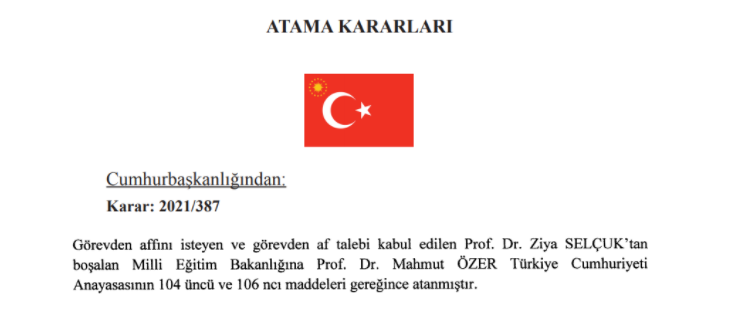 Erdoğan imzasıyla Resmi Gazete'de yayımlanan kararda, Ziya Selçuk'un 'görevden af talebinin kabul edildiği' bildirilirken, Milli Eğitim Bakanlığı'na Bakan Yardımcısı Mahmut Özer'in atandığı açıklandı. Kararda, "Görevden affını isteyen ve görevden af talebi kabul edilen Prof. Dr. Ziya Selçuk'tan boşalan Milli Eğitim Bakanlığına Prof. Dr. Mahmut Özer Türkiye Cumhuriyeti Anayasasının 104 üncü ve 106 ncı maddeleri gereğince atanmıştır" denildi.