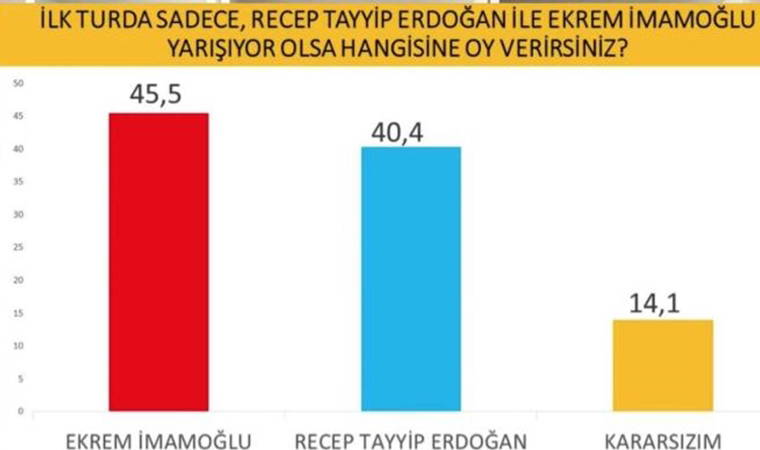 Yapılan araştırmada “Erdoğan aday olursa oy veririm” diyenlerin oranı yüzde 39-40 bandında kalırken, “Oy vermem” diyenlerin oranı yüzde 46-47 aralığında. Muhalefet tek aday çıkarttığında ise Erdoğan’ın kazanma şansı iyice düşüyor. İmamoğlu ve Erdoğan’ın yarıştığı bir senaryoda kararsızlar dağıtılmadan önce İmamoğlu’nun oyu yüzde 45,5 olurken, Erdoğan’ın oy oranı 40,4’te kaldı. Araştırma sonuçlarına göre kararsızların verdikleri cevaplar, muhalefete daha yakın oldukları yönünde.Yani kararsızlar eklendiğinde İmamoğlu’nun oyu daha da artıyor ve fark giderek açılıyor. Erdoğan’ın karşısında Mansur Yavaş aday olduğunda ise yüzde 39,7 alırken Erdoğan 39,9 oy alıyor. Kararsızlar dağıtıldığında ise Yavaş da Erdoğan’ı geride bırakıyor.