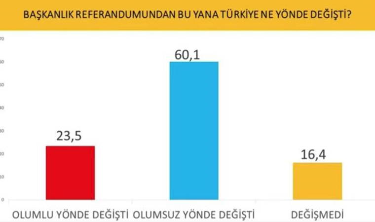 Katılımcılara sorulan 2017 yılındaki ‘Başkanlık Referandumu’ndan bu yana Türkiye’nin ne yönde değiştiği sorusuna ise yüzde 23,5 olumlu yönde değiştiği beyanında bulunurken; yüzde 60,1 ise olumsuz yönde değiştiğini söyledi. Türkiye’nin o zamandan bu yana hiç değişmediğini söyleyenlerin oranı ise yüzde 16,4 olarak açıklandı.