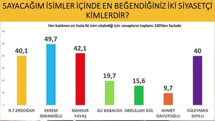 Katılımcılara sorulan “en beğenilen siyasetçiler” sorusunda ise yüzde 49,7 ile Ekrem İmamoğlu birinci olurken, İçişleri Bakanı Süleyman Soylu’nun yüzde 40 oran ile Cumhurbaşkanı ve AKP Genel Başkanı Erdoğan’dan sadece yüzde 0,1 oranında az oy olması dikkat çekti.