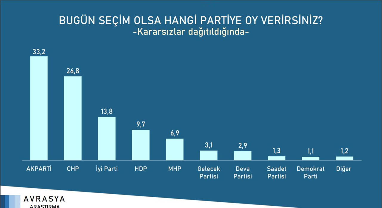 Kararsızlar dağıtıldığında AKP’nin oyları yüzde 33.2, MHP’nin oyları yüzde 6.9 olarak paylaşılırken; CHP yüzde 26.8, İYİ Parti ise yüzde 13.8 bandında yer aldı.