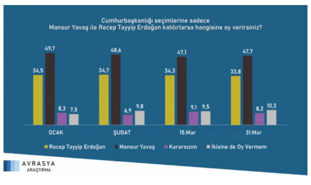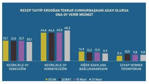 Ankette, "Recep Tayyip Erdoğan tekrar cumhurbaşkanı adayı olursa oy verir misiniz?" sorusuna ise, ocak ayında yüzde 44,6, şubatta yüzde 44,4, 15 Mart tarihinde yüzde 45, 31 Mart'te ise yüzde 48,2 oranında "kesinlikle oy vermeyeceğim" yanıtı verildi.