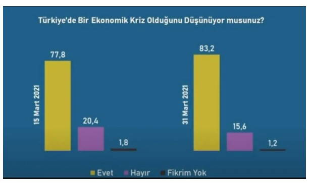 Ankete katılanlar "Türkiye'de bir ekonomik kriz olduğunu düşünüyor musunuz?" sorusuna ise 15 Mart 2021 tarihinde yüzde 77,8 oranında, 31 Mart 2021 tarihinde ise yüzde 83,2 oranında "Evet" yanıtını verdi.