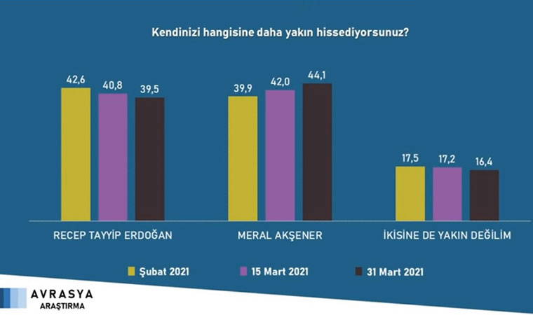 Öte yandan Erdoğan ve İYİ Parti Genel Başkanı Meral Akşener ile ilgili bir soruda "Kendinizi hangisine daha yakın hissediyorsunuz?" diye soruldu. Soruya cevap veren vatandaşların yüzde 44,1’i Akşener’i tercih ederken, yüzde 39,5’i "Recep Tayyip Erdoğan" dedi.