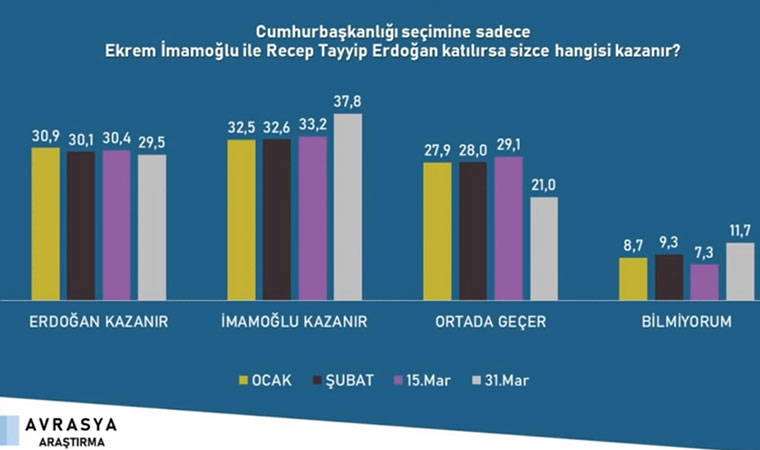 Ankette "Cumhurbaşkanlığı seçimine sadece Ekrem İmamoğlu ile Recep Tayyip Erdoğan katılırsa sizce hangisi kazanır?" sorusu da yer aldı. Verilen yanıtlarda "Erdoğan kazanır" diyenlerin oranı yüzde 29,5 olurken, "İmamoğlu kazanır" diyenlerin oranı ise 37,8 oldu.