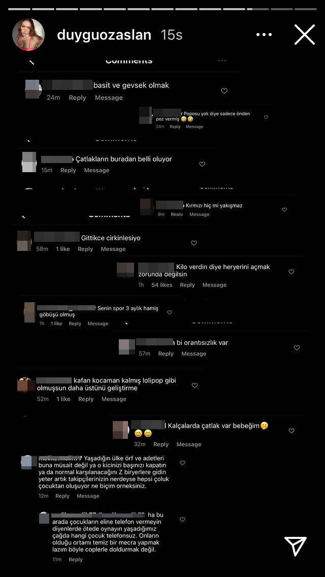 Paylaşıma binlerce beğeninin yanı sıra, cinsiyetçi ve hakaret içerikli yorumlar da geldi. Özaslan, gelen kötü yorumları sosyal medya hesabı Instagram'ın hikaye kısmından paylaştı.