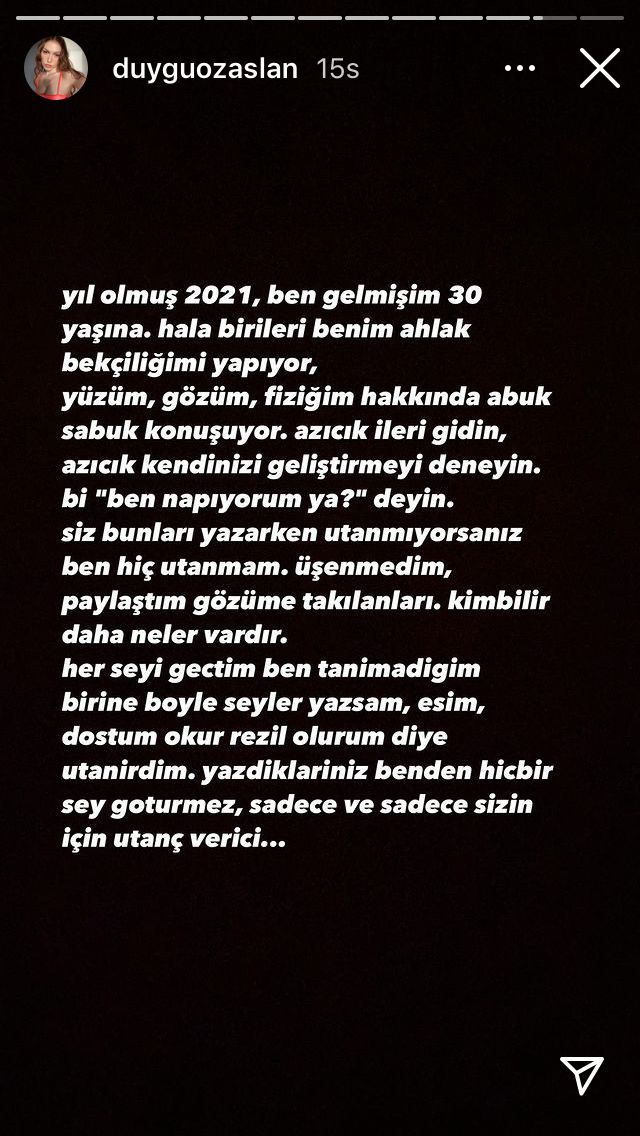 Özaslan başka bir paylaşımda da, "Yıl olmuş 2021, ben gelmişim 30 yaşına... Hala birileri benim ahlak bekçiliğimi yapıyor, yüzüm, gözüm, fiziğim hakkında abuk sabuk konuşuyor. Azıcık ilerin gidin, azıcık kendinizi geliştirmeyi deneyin. Bir 'Ben ne yapıyorum ya' deyin. Siz bunları yazarken utanmıyorsanız beni hiç utanmam. Üşenmedim, paylaştım gözüme takılanları, kim bilir daha neler vardır. Her şeyi geçtim ben tanımadığım birine böyle şeyle yazsam, eşim, doktum okur rezil olurum diye utanırdım. Yazıklarınız benden hiçbir şey götürmez. Sadece ve sadece sizin için utanç verici" diyerek tepki gösterdi.