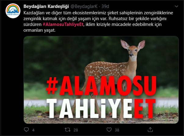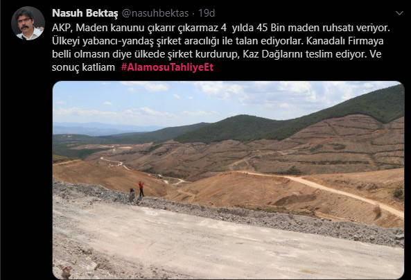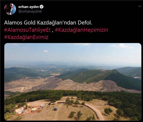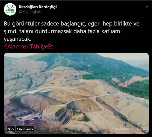 Alamos'un tahliyesi için sosyal medyadan çağrı yapan yurttaşlar, maden şirketinin ağaç kestiği bölgenin, talan ettiği ormanların görsellerini paylaşarak tepki gösterdi.