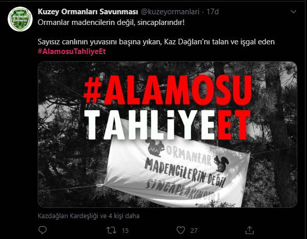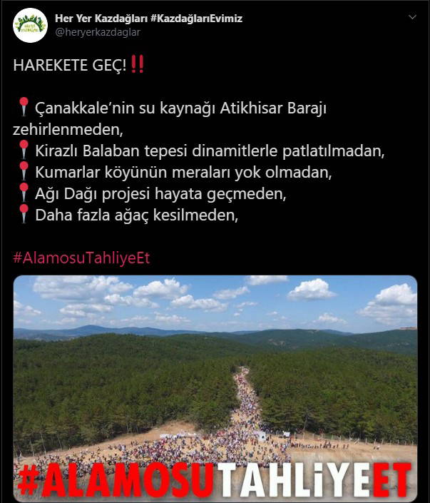 Sosyal medyada örgütlenen yurttaşlar maden şirketine bırakılan doğa harikası Kazdağları'ndan derhal tahliye edilmesini ve talan edilen yerlerin rehabilite edilmesini istedi.