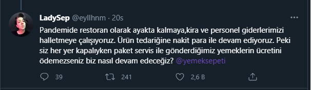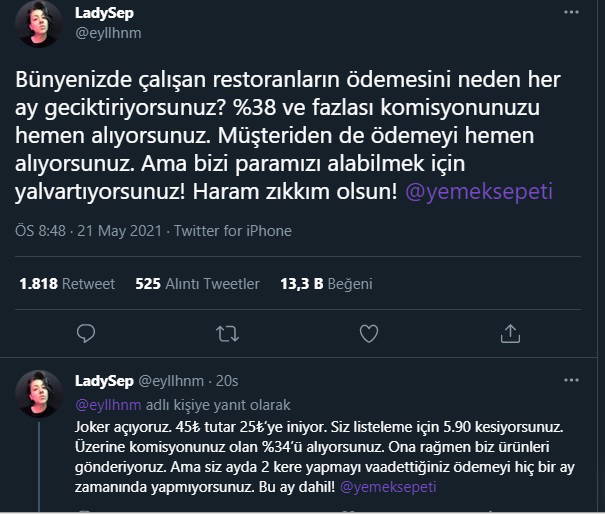 Sosyal medya üzerinden Yemeksepeti'nin kurumsal hesabını etiketleyeyen restoran sahibi, ''Bünyenizde çalışan restoranların ödemesini neden her ay geciktiriyorsunuz? yüzde 38 ve fazlası komisyonunuzu hemen alıyorsunuz. Müşteriden de ödemeyi hemen alıyorsunuz. Ama bizi paramızı alabilmek için yalvartıyorsunuz! Haram zıkkım olsun'' diyerek isyan etti.