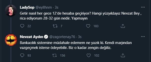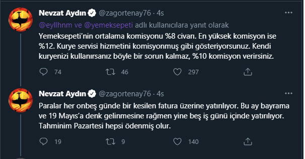 Restoran sahibine sosyal medya hesabı üzerinden yanıt Yemeksepeti CEO'su Nevzat Aydın, ''Yemeksepeti’nin ortalama komisyonu yüzde 8 civarı. En yüksek komisyon ise yüzde 12. Kurye servisi hizmetini komisyonmuş gibi gösteriyorsunuz. Kendi kuryenizi kullanırsanız böyle bir sorun kalmaz, yüzde 10 komisyon verirsiniz. Paralar her onbeş günde bir kesilen fatura üzerine yatırılıyor. Bu ay bayrama ve 19 Mayıs’a denk gelinmesine rağmen yine beş iş günü içinde yatırılıyor. Tahminim Pazartesi hepsi ödenmiş olur" dedi.