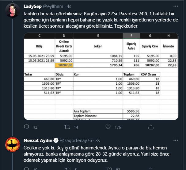 Restoran sahibi, ''Joker açıyoruz. 45 TL tutar 25 TL’ye iniyor. Siz listeleme için 5.90 kesiyorsunuz. Üzerine komisyonunuz olan yüzde 34’ü alıyorsunuz. Ona rağmen biz ürünleri gönderiyoruz. Ama siz ayda 2 kere yapmayı vaadettiğiniz ödemeyi hiç bir ay zamanında yapmıyorsunuz. Bu ay dahil! Pandemide restoran olarak ayakta kalmaya,kira ve personel giderlerimizi halletmeye çalışıyoruz. Ürün tedariğine nakit para ile devam ediyoruz. Peki siz her yer kapalıyken paket servis ile gönderdiğimiz yemeklerin ücretini ödemezseniz biz nasıl devam edeceğiz'' diye sordu.