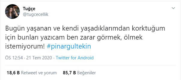 Çelik, Pınar Gültekin’in öldürülmesinin ardından "Bugün yaşanan ve kendi yaşadıklarımdan korktuğum için bunları yazacağım ben zarar görmek, ölmek istemiyorum" ifadelerini kullanarak, yaşadıklarını anlattı.