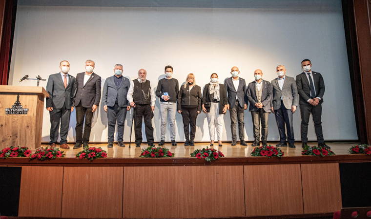Törende Başkan Soyer, logo tasarım yarışmasını kazanan Mahir Akkoyun'a bir plaket takdim etti.