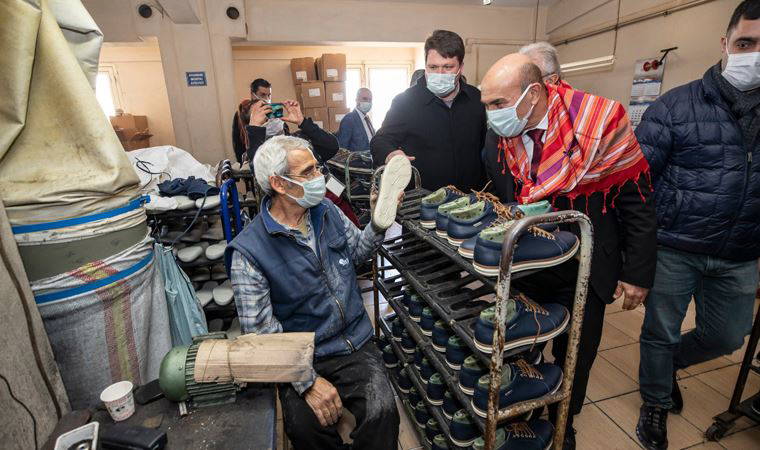 Başkan Soyer, ardından beraberindekilerle Ödemiş Ayakkabıcılar Sitesi esnafını ziyaret etti. Esnafın sıkıntılarını dinleyen Başkan Soyer, sektörü rahatlatan önemli açıklamalarda bulundu. Ödemiş Ayakkabı Üretim ve Pazarlama Kooperatifi ile işbirliği yaparak ayakkabıda bir İzmir markası yaratmak ve tüm dünyaya pazarlamak için beraber çalışacaklarının müjdesini veren Soyer, “Kooperatif başkanımız meclis üyemizle beraber belediyeye gelmiş, kooperatifin uzun süredir kan kaybettiğini anlatmıştı. Biz de İzmir Büyükşehir Belediyesi olarak nasıl destek olabileceğimizi konuştuk. Bizim her sene personelimiz için ihtiyaç duyduğumuz ürünlerden biri olan ayakkabıyı 'niye kooperatiften almayalım' diye konuştuk” dedi.