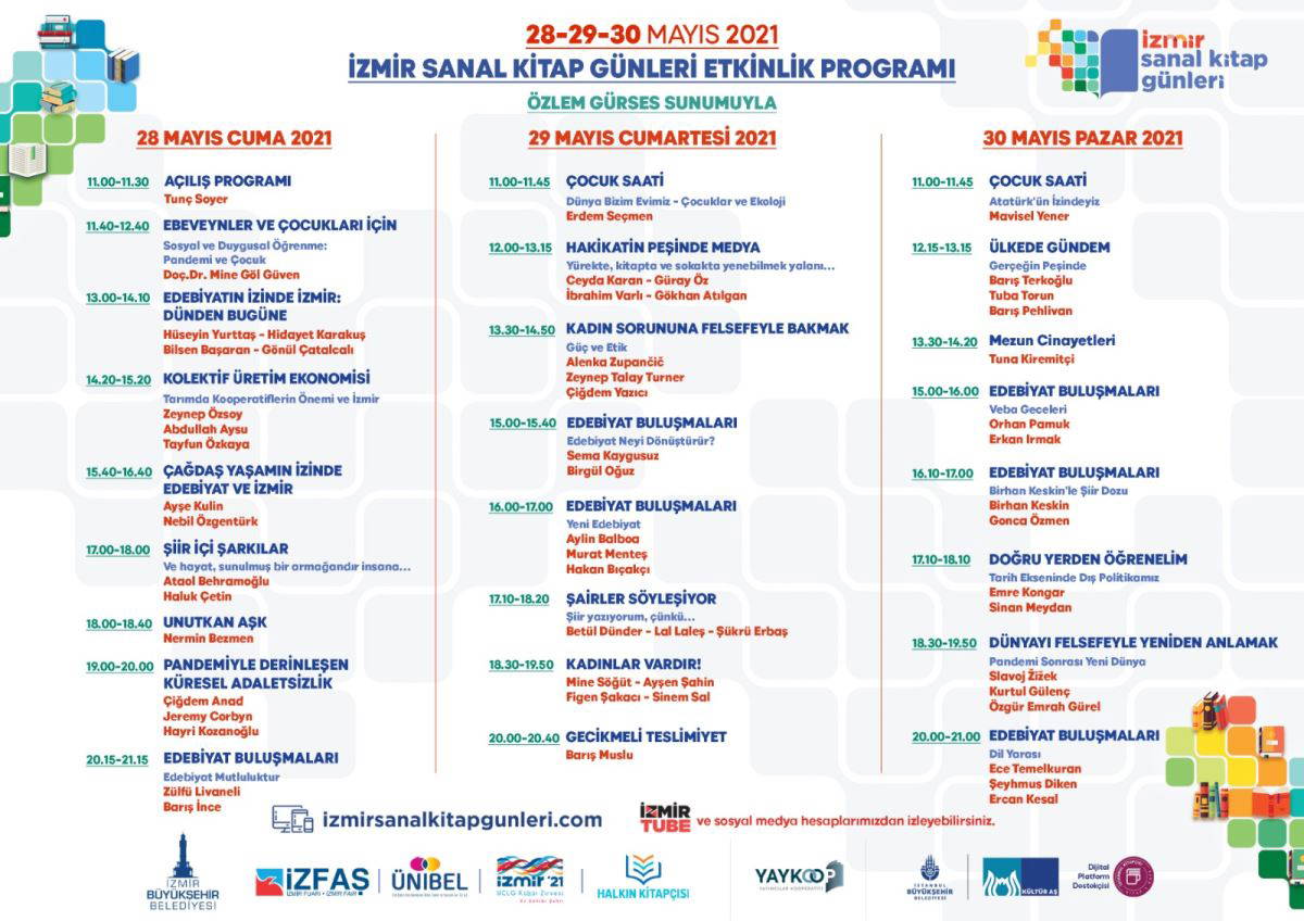 Ziyaretçiler İzmir Sanal Kitap Günleri’nde üç gün boyunca online söyleşilere canlı olarak katılabilecek. Söyleşiler, gazeteci Özlem Gürses moderatörlüğünde yapılacak. Marksist sosyolog, filozof ve kültür eleştirmeni Sloven Slavoj Zizek, “Dünyayı Felsefeyle Yeniden Anlamak” söyleşisinde Türkiye’den akademisyenler Kurtul Gülenç ve Özgür Emrah Gürel birlikte yer alacak. Sloven filozof Alenka Zupancic ise “Kadın Sorununa Felsefeyle Bakmak söyleşisine ise Zeynep Talay Turner ve Çiğdem Yazıcı eşlik edecek. İngiliz siyasetçi Jeremy Corbyn ilk kez Türkiye’de düzenlenen bir etkinliğe konuk olacak. Corbyn, Hayri Kozanoğlu ve Çiğdem Anad’la “Pandemiyle Derinleşen Küresel Adaletsizlik” söyleşisinde dünya siyasetini yorumlayacak. Nobel Edebiyat Ödüllü yazar O rhan Pamuk ise Edebiyat Buluşmaları'nda yazar Erkan Irmak ile birlikte son kitabı Veba Geceleri'ni anlatacak.