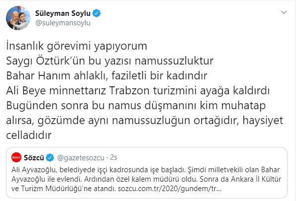 Söz konusu yazıyı sosyal medya hesabından paylaşan İçişleri Bakanı Süleyman Soylu, Saygız Öztürk'ü doğrudan hedef alarak "namus düşmanı"dedi.