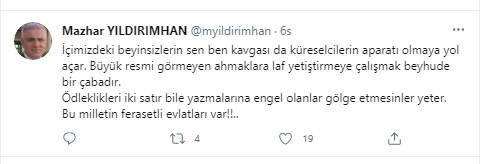 “Ahmaklar”, “Beyinsizler” ve “Ödlekler” diyen Yıldırımhan, Twitter’dan yaptığı açıklamalarında, “İçimizdeki beyinsizlerin sen ben kavgası da küreselcilerin aparatı olmaya yol açar. Büyük resmi görmeyen ahmaklara laf yetiştirmeye çalışmak beyhude bir çabadır. Ödleklikleri iki satır bile yazmalarına engel olanlar gölge etmesinler yeter. Bu milletin ferasetli evlatları var”