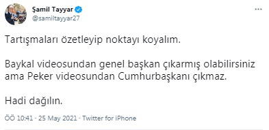 Tayyar, CHP'de Kemal Kılıçdaroğlu'nun parti liderliğine seçildiği döneme gönderme yapıp "Tartışmaları özetleyip noktayı koyalım. Baykal videosundan genel başkan çıkarmış olabilirsiniz ama Peker videosundan Cumhurbaşkanı çıkmaz. Hadi dağılın." ifadelerini kullandı.