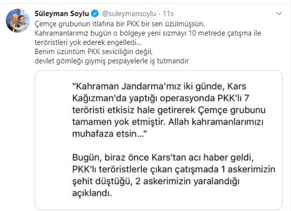Soylu ise Yıldız’ın paylaşımını alıntılarak Yıldız’ı hedef alıp “Çemçe grubunun itlafına, bir PKK bir sen üzülmüşsün. Kahramanlarımız bugün o bölgeye yeni sızmayı 10 metrede çatışma ile teröristleri yok ederek engelledi… Benim üzüntüm PKK seviciliğin değil, devlet gömleği giymiş pespayelerle iş tutmandır” ifadelerini kullandı.