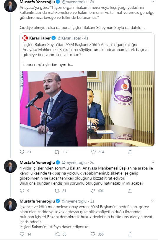 Twitter'dan Soylu'nun AYM Başkanı'na yönelik sözlerini eleştiren Yeneroğlu, Anayasa'da yer alan "Hiçbir organ, makam, merci veya kişi, yargı yetkisinin kullanılmasında mahkemelere ve hakimlere emir ve talimat veremez; genelge gönderemez; tavsiye ve telkinde bulunamaz." sözünü hatırlatıp "Ciddiye almıyor olsa da buna İçişleri Bakanı Süleyman Soylu da dahildir." diye yazdı.