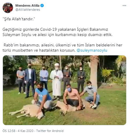 Eski belediye başkanı Menderes Atilla, Bakan Soylu'nun kendisi, kızı ve eşinin koronavirüs testinin pozitif çıktığını açıklaması üzerine Soylu ve ailesi için "şifa kurbanı" adı altında 3 adet kurban kestirdi.