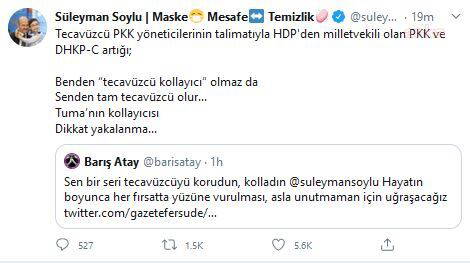 Atay'a cevap veren Soylu, ''Tecavüzcü PKK yöneticilerinin talimatıyla HDP'den milletvekili olan PKK ve DHKP-C artığı; Benden 'tecavüzcü kollayıcı' olmaz da senden tam tecavüzcü olur... Tuma'nın kollayıcısı... Dikkat yakalanma" yanıtını verdi.