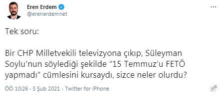 CHP Parti Meclisi Üyesi Eren Erdem, Soylu'nun sözleri üzerine sosyal medya hesabından "tek soru" diyerek şöyle yazdı: