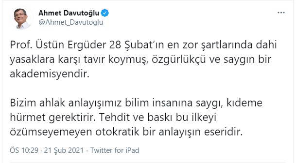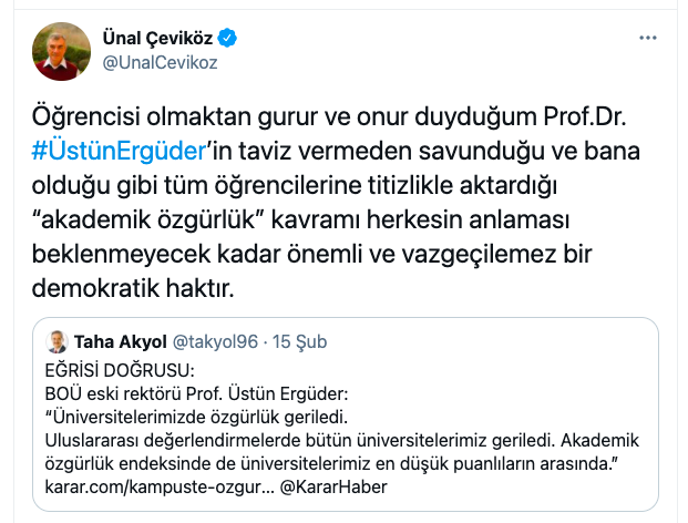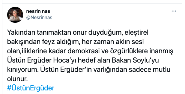 "Yakından tanımaktan onur duyduğum, eleştirel bakışından feyz aldığım, her zaman aklın sesi olan, iliklerine kadar demokrasi ve özgürlüklere inanmış Üstün Ergüder Hoca’yı hedef alan Bakan Soylu’yu kınıyorum. Üstün Ergüder’in varlığından sadece mutlu olunur."